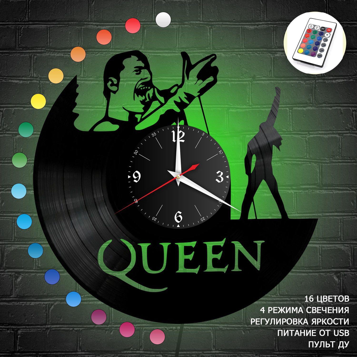 Часы с подсветкой, изготовлены из настоящей виниловой пластинки. Диаметр часов 30 см, диаметр циферблата 11 см. Плавный ход секундной стрелки. Надежный кварцевый часовой механизм. Питание: 1 элемент АА. Настенные часы группа Queen из винила, версия 3 - это оригинальный подарок, который способен удивить любого. Все настенные часы изготовлены из настоящих виниловых пластинок. Компания имеет собственное производство по изготовлению настенных часов из виниловых пластинок. Высокий уровень детализации и превосходное качество исполнения, делают такие настенные часы уникальным подарком. В нашем ассортименте представлены более 1100 моделей часов из виниловых пластинок.