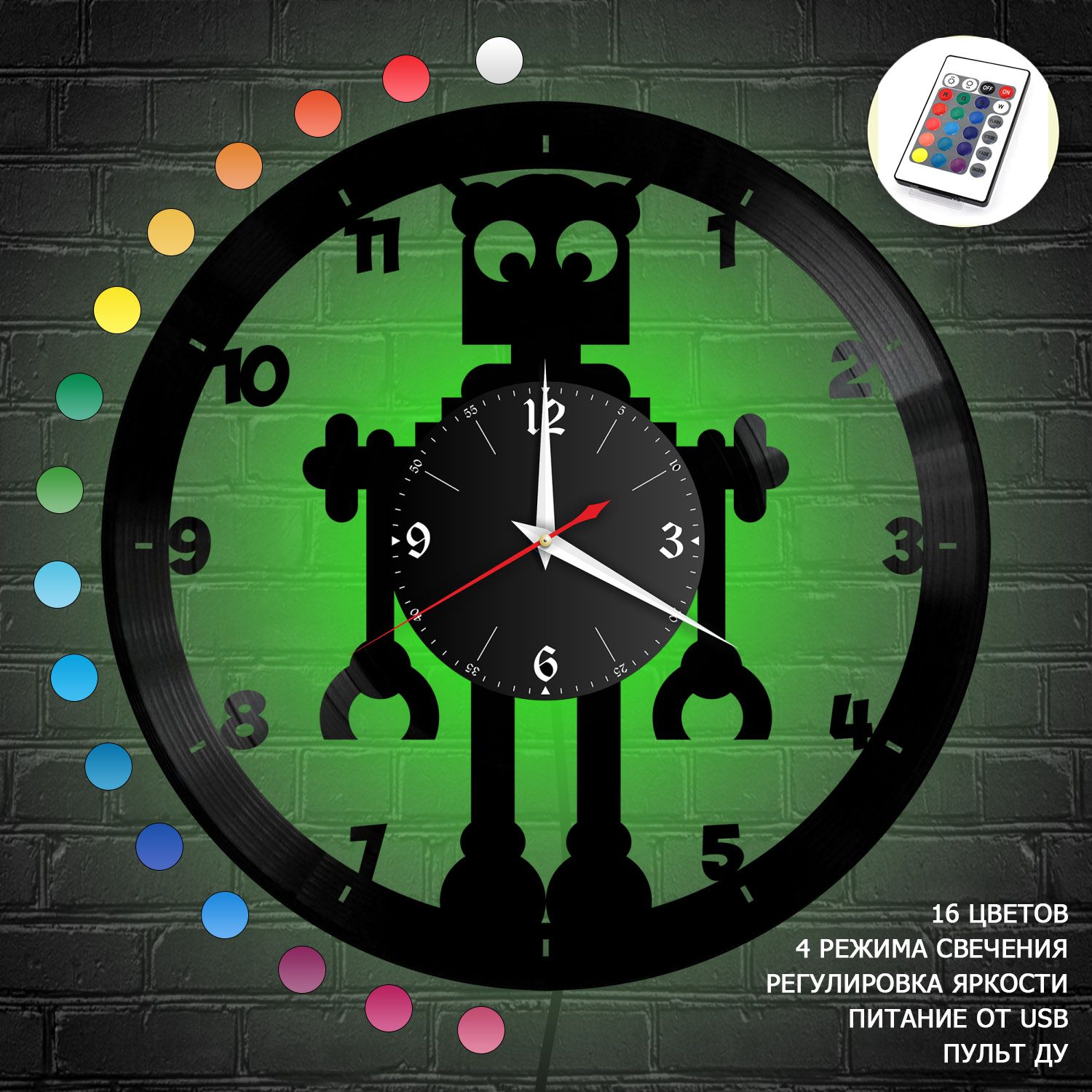 Часы с подсветкой, изготовлены из настоящей виниловой пластинки. Диаметр часов 30 см, диаметр циферблата 11 см. Плавный ход секундной стрелки. Надежный кварцевый часовой механизм. Питание: 1 элемент АА. Настенные часы Робот из винила, версия 1 - это оригинальный подарок, который способен удивить любого. Все настенные часы изготовлены из настоящих виниловых пластинок. Компания имеет собственное производство по изготовлению настенных часов из виниловых пластинок. Высокий уровень детализации и превосходное качество исполнения, делают такие настенные часы уникальным подарком. В нашем ассортименте представлены более 1100 моделей часов из виниловых пластинок.